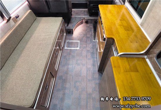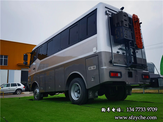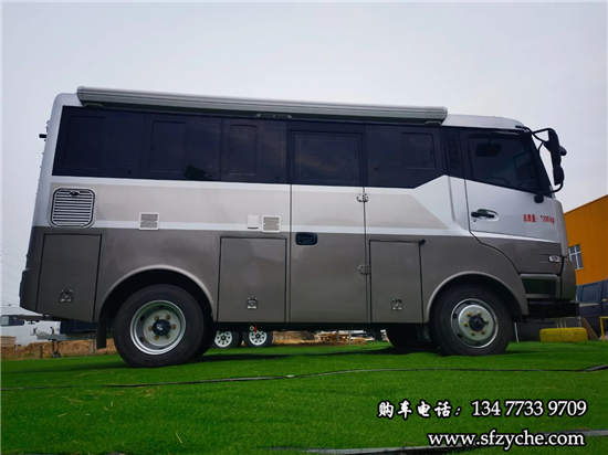 車身右側(cè)配備了4m的電動遮陽棚、市電接口、尾部工具箱、戶外照明燈,中置上客門,副駕駛乘客門,車輛門鎖均采用越野專用倉門鎖。