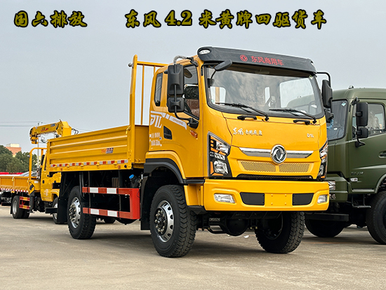 東風(fēng)黃牌4.2米原廠四驅(qū)貨車,DFV1101GP6D型四驅(qū)載貨汽車,該車驅(qū)動形式為4×4全輪驅(qū)動,采用東風(fēng)牌DFV5101TGP6DJ型特種作業(yè)底盤,采用東風(fēng)D1L一排半駕駛室?guī)г瓘S空調(diào),4×4驅(qū)動,選裝玉柴YCY30170-60和玉柴YCS04180-60發(fā)動機(jī),韶齒五檔變速箱,杭齒450分動箱帶高低擋,分時四驅(qū),軸距:3500mm,295/80R22.5越野輪胎,4T前橋,8T后橋,電動玻璃,方向助力,斷氣剎,帶ABS。車廂長4.2米,整車長6.05米,接近角33度,離去角17度,最小離地間隙35公分,涉水深度0.8米。