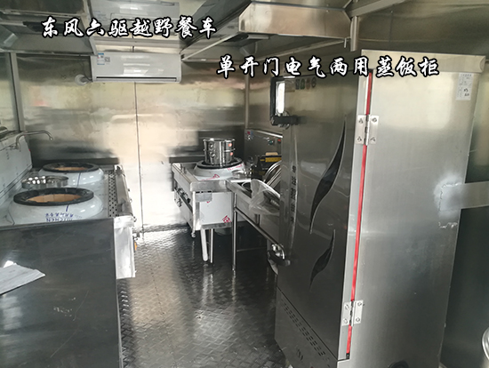 東風(fēng)六驅(qū)越野餐車車輛概述:采用東風(fēng)國五越野底盤改裝, 車廂材質(zhì)采用外冷軋鋼板,內(nèi)飾不銹鋼,中間保溫層,隱藏式上車踏步,頂部安全窗,兩個(gè)副食灶,一個(gè)蒸飯車,抽油煙機(jī),平冷柜,水路,電路,油路等。