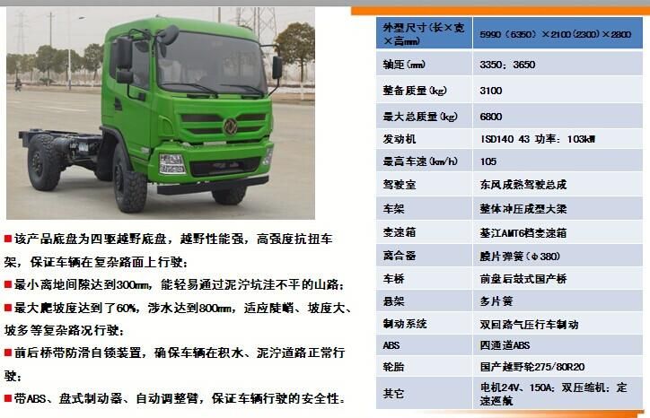 相關車型EQ2070GZ4DJ越野四驅底盤的詳細描述:該產(chǎn)品底盤為四驅越野底盤,越野性能強,高強度抗扭車架,保證車輛在復雜路面上行駛時,不會出現(xiàn)大梁斷裂等情況;最小離地間隙達到300mm,能輕易通過泥濘坑洼不平的山路;最大爬坡度達到了60%,適應陡峭、坡度大、坡多等復雜路況行駛。前后橋帶防滑自鎖裝置,確保車輛在積水、泥濘道路正常行駛;帶ABS、盤式制動器、自動調整臂,保證車輛行駛的安全性。