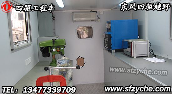 廂體頂部封閉,不可開啟。可配裝功率相當、其他型號的發(fā)電機組。駕駛室前方安裝電動絞盤、廂體前部安裝備胎和可升降照明裝置、廂體內部安裝有發(fā)電機組、電焊機、線纜盤、臺虎鉗、切割機、工作臺等維修工具。側防護、后防護與車輛均采用焊接連接,材料均為:Q235,后防護斷面尺寸(mm):100×60, 離地高度:500 mm.
