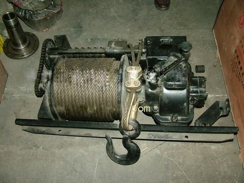 ——這種絞盤和船用的一樣,但它是直放而非一般的橫放形式。更特別的是,它上面沒有繞上鋼纜或麻繩,而僅有一個(gè)圓柱形的絞動鼓。使用這個(gè)PTO時(shí)比現(xiàn)代的絞盤還要簡單,只要開著引擎并把絞盤旁邊的波棍推進(jìn),圓柱體馬上會自轉(zhuǎn)。此時(shí)再將麻繩套在絞動鼓上一二圈,繩的另一端則以人手把持著,操作人用力拉,麻繩便會隨著絞動體一起轉(zhuǎn)。只要操作人不用力拉,繩子一放松,絞動鼓則自行旋轉(zhuǎn)但不會帶動麻繩。它的缺點(diǎn)是不能倒轉(zhuǎn)。